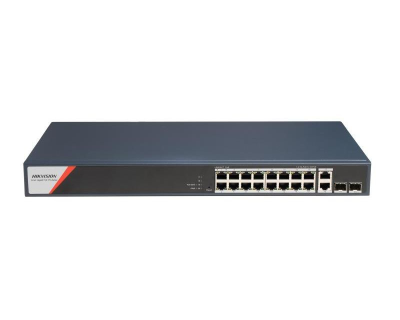 Switche a POE napájení HikVision 20 portový switch - 4x HiPoE 90W 1Gbps + 12x PoE 30W 1Gbps + 2x uplink RJ-45 1Gbps + 2x uplink SFP slot 1Gbps, PoE celkem max. 230W, základní management, prodloužený režim (porty 1 - 16), kovové šasi, stavové LED, hmotnost 2.7kg, rozměry 440 x 44 x 220mm, provozní teploty 0°C až +45°C, napájení 230VAC 20W