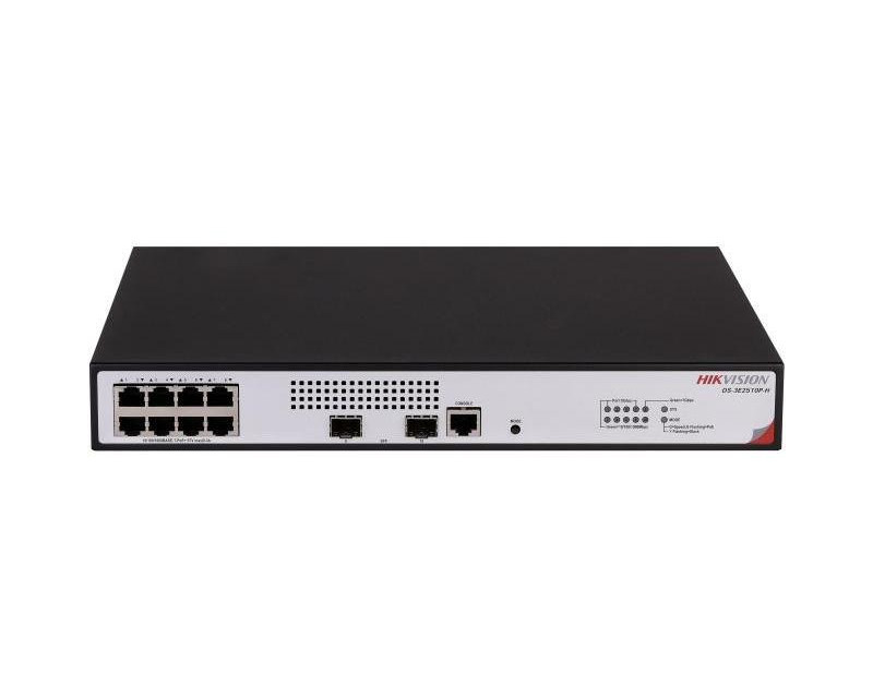 Switche a POE napájení HikVision 10 portový switch - 8x PoE 30W 1Gbps + 2x uplink SFP slot 1Gbps, PoE celkem max. 125W, pokročilý management, kovové šasi, stavové LED, hmotnost 2.3kg, rozměry 333 x 44 x 230mm RACK 1U, provozní teploty -5°C až +45°C, napájení 230VAC 13W