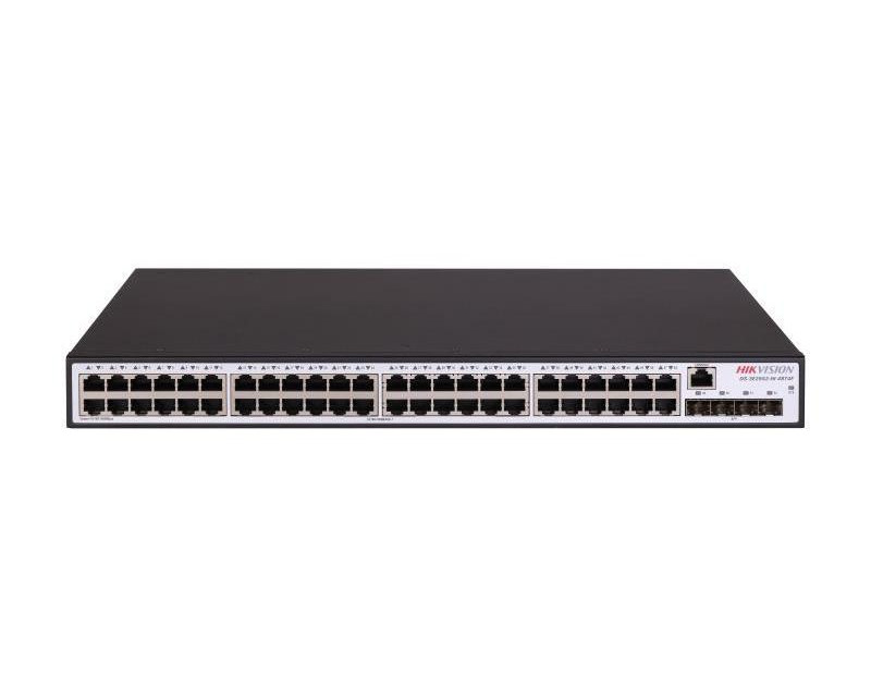 Switche a POE napájení HikVision 52 portový switch - 48x RJ-45 1Gbps + 4x uplink SFP slot 1Gbps, pokročilý management, 1x Console port, kovové šasi, stavové LED, hmotnost 3.1kg, rozměry 440 x 44 x 260mm 19" 1U, provozní teploty -5°C až +45°C, napájení 230VAC 39W