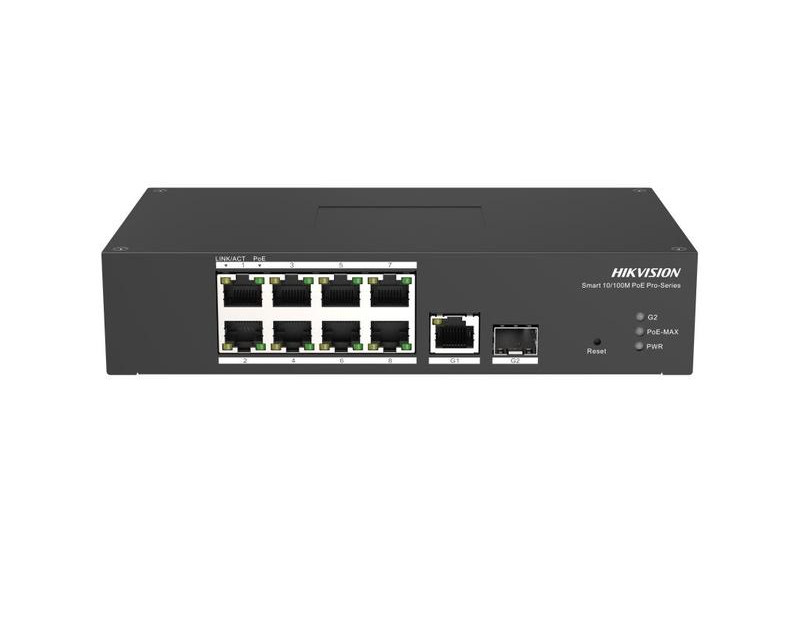 Switche a POE napájení HikVision 10 portový průmyslový switch - 8x PoE 30W 100Mbps + 1x uplink RJ-45 1Gbps + 1x uplink SFP slot 1Gbps, PoE celkem max. 110W, s managementem, prodloužený režim (porty 1 - 8), kovové šasi, bez ventilátoru, stavové LED, rozměry 197 x 114 x 42mm, instalace na DIN lištu, provozní teploty -30°C až +65°C, hmotnost 0.6kg, napájení 48-57VDC 10W (bez zdroje)