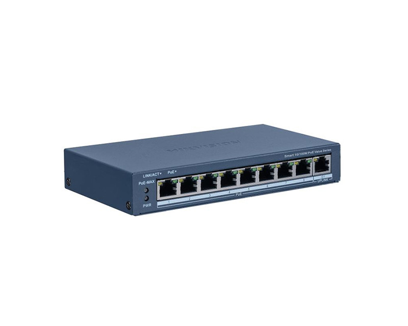 Switche a POE napájení HikVision 9 portový switch - 8x PoE 30W 100Mbps + 1x uplink RJ-45 1Gbps, PoE celkem max. 60W, základní management (v iVMS-4200), prodloužený režim (porty 1 - 8), kovové šasi, bez ventilátoru, stavové LED, hmotnost 0.4kg, rozměry 170 x 28 x 93mm, provozní teploty 0°C až +40°C, napájení 48VDC 5W, zdroj součástí