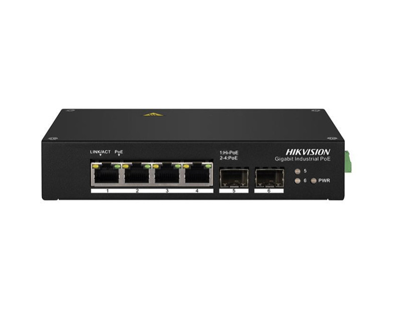 Switche a POE napájení HikVision 6 portový průmyslový switch - 1x HiPoE 90W 1Gbps + 3x PoE 30W 1Gbps + 2x uplink SFP slot 1Gbps, PoE celkem max. 110W, bez managementu, kovové šasi, bez ventilátoru, stavové LED, rozměry 158 x 101 x 32mm, instalace na DIN lištu, provozní teploty -40°C až +75°C, napájení 48-57VDC 10W (bez zdroje)