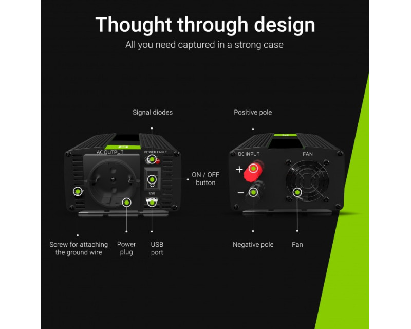 Tento převodník je vybaven ochranou proti přetížení, přehřátí a zkratu, což zajišťuje bezpečné používání. Má také integrovaný ventilátor pro chlazení, který se zapne, aby byla zajištěna správná teplota měniče a konvertor správně pracoval. Ventilátor je výkonný, ale tichý a rozhodně vás nebude rušit.