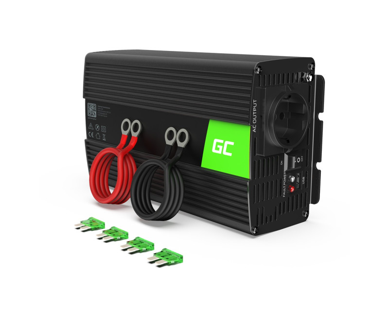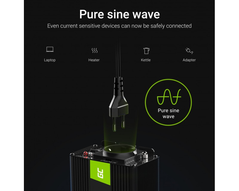 Green Cell® Car Power Inverter z 12V na 230V Pure sine je zařízení, které umožňuje převod stejnosměrného napětí z 12V baterie na střídavé napětí 230V. Tento převodník je schopen poskytnout stálý výkon až 1000W se špičkovým výkonem až 2000W. Jedná se o zařízení s čistou sinusovou vlnou, což znamená, že poskytuje stabilní a kvalitní napájení pro vaše elektrické zařízení.