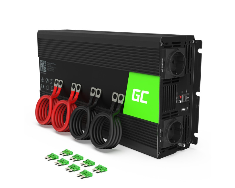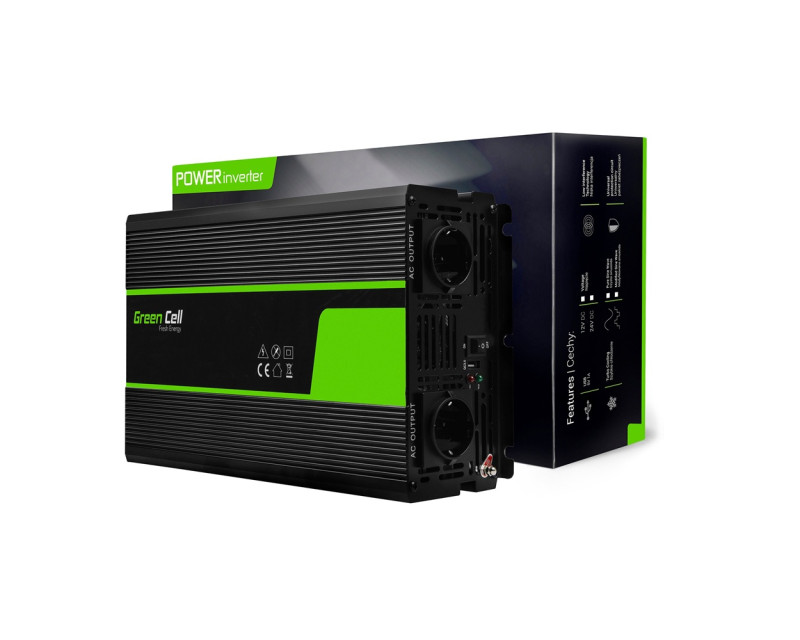 Green Cell® Car Power Inverter z 12V na 230V Pure sine je zařízení, které umožňuje převod stejnosměrného napětí z 12V baterie na střídavé napětí 230V. Tento převodník je schopen poskytnout stálý výkon až 2000W se špičkovým výkonem až 4000W. Jedná se o zařízení s čistou sinusovou vlnou, což znamená, že poskytuje stabilní a kvalitní napájení pro vaše elektrické zařízení.