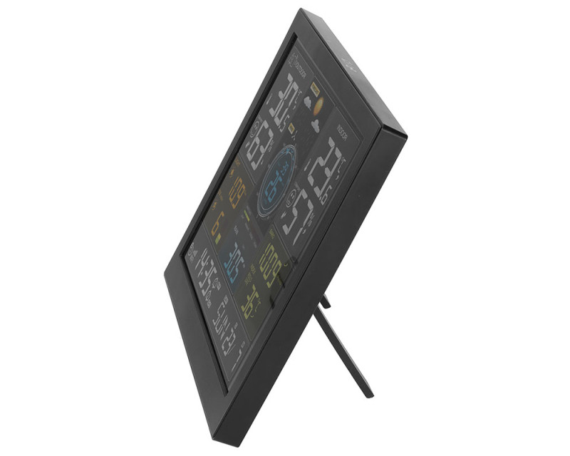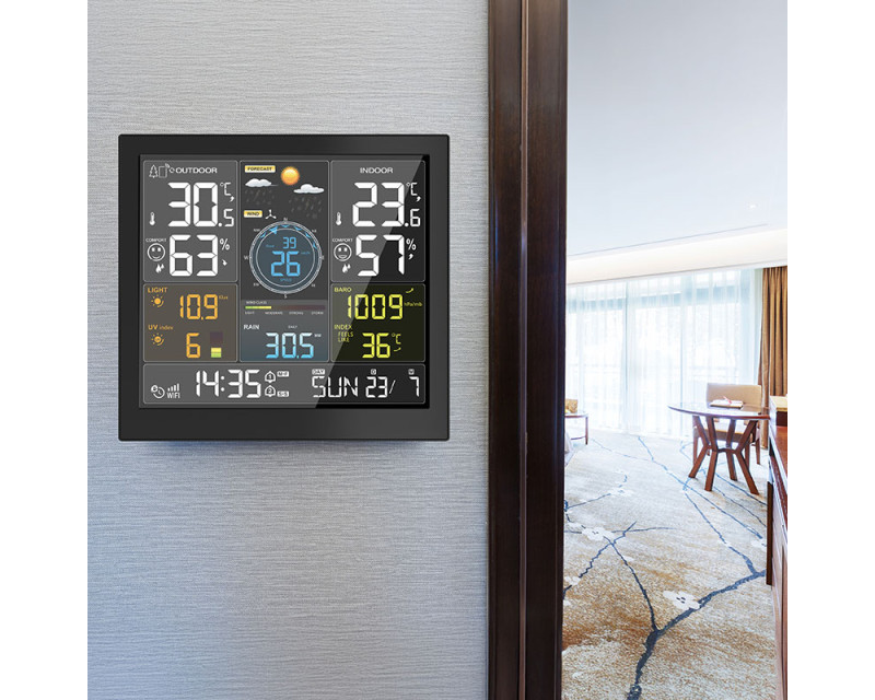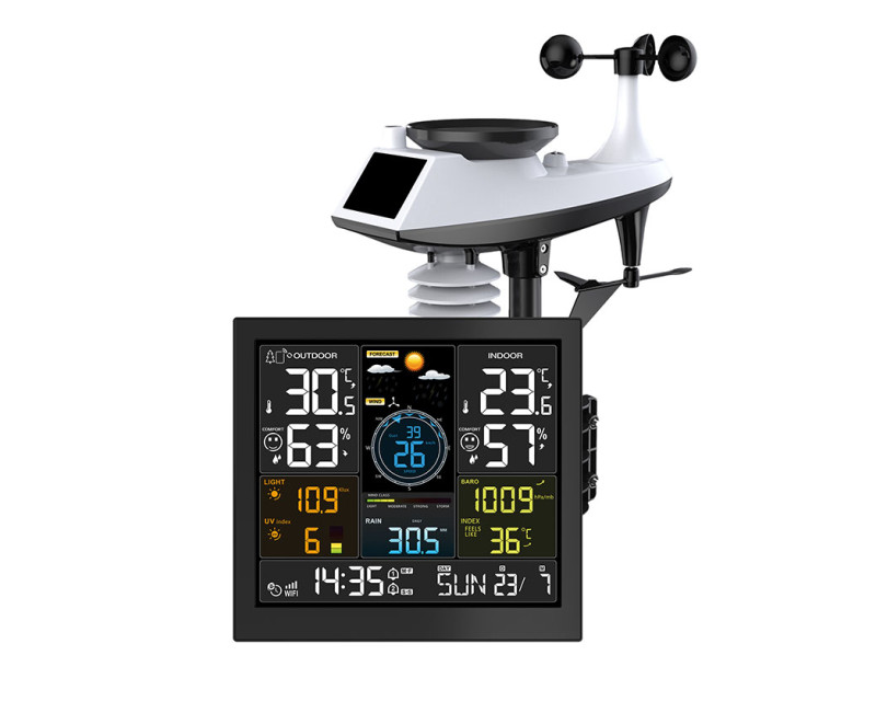 Tato profesionální meteostanice s velkým 24,4cm displejem nabízí WiFi připojení a propojení s aplikací Tuya/Smart Life pro zobrazení aktuálních hodnot a statistik. Měří vnitřní (-20 °C až 50 °C) a venkovní teplotu (-40 °C až 70 °C), vlhkost (20 % až 95 %), rychlost větru (0 až 180 km/h), směr větru (0–359°), srážky (0 až 9999 mm), atmosférický tlak (600–1100 hPa), intenzitu světla (0–128 klux) a UV index (0–15). Nabízí automatickou synchronizaci času, zobrazení dne v týdnu v 15 jazycích, dva denní budíky se snooze funkcí (5–60 min nebo vypnuto) a kalendář do roku 2099. Předpověď počasí na 12 hodin využívá tlak vzduchu a zobrazuje ikony jako slunečno, oblačno, déšť nebo sněžení. Bezdrátové senzory s dosahem až 100 m umožňují připojení 1× multi-combination senzoru a až 3 teplotních/vlhkostních senzorů. Napájení DC 5V / 1A adaptér + záložní 2× AA baterie, senzory na AAA baterie. Díky propojení s aplikací, široké škále měření a preciznímu zpracování je ideální volbou pro všechny, kdo chtějí mít meteorologická data vždy po ruce.