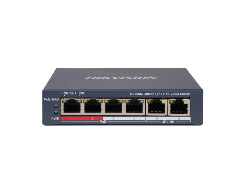 Switche a POE napájení HikVision 6 portový switch - 4x PoE 30W 10/100Mbps + 2x uplink RJ-45 10/100Mbps, PoE celkem max. 45W, bez managementu, prodloužený režim (porty 1 - 4), kovové šasi, bez ventilátoru, stavové LED, hmotnost 0.2kg, rozměry 121 x 28 x 83mm, provozní teploty 0°C až +40°C, napájení 54VDC - 5W, zdroj součástí