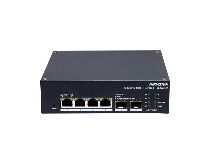 Switche a POE napájení HikVision 6 portový průmyslový switch - 1x HiPoE 90W 1Gbps + 3x PoE 30W 1Gbps + 2x uplink SFP slot 1Gbps, PoE celkem max. 120W/60W (napájení 54V DC/12-24VDC), s managementem, prodloužený režim (porty 1 - 4), možnost připojení FV panelu s baterií, RS-485, kovové šasi, bez ventilátoru, stavové LED, rozměry 158 x 130 x 44mm, instalace na DIN lištu, provozní teploty -40°C až +75°C, hmotnost 0.7kg, napájení 12/24/54VDC 10W (bez zdroje), IP30, doporučený FV panel DS-2XS6K01-C120S180