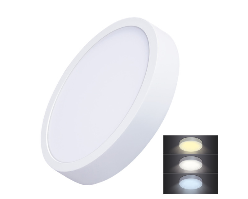 Silný a efektivní kulatý přisazený LED panel s výkonem 24 W je navržen pro osvětlení větších místností s důrazem na kvalitu a rovnoměrné rozložení světla. Pomocí přepínače můžete volit mezi teplotami světla 3000K, 4000K nebo 6000K a přizpůsobit tak atmosféru prostoru dle potřeby. Se světelným tokem 1800 lm a širokým úhlem svícení 160° je ideální do kanceláří, obývacích pokojů nebo komerčních prostor.