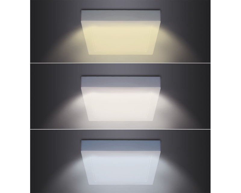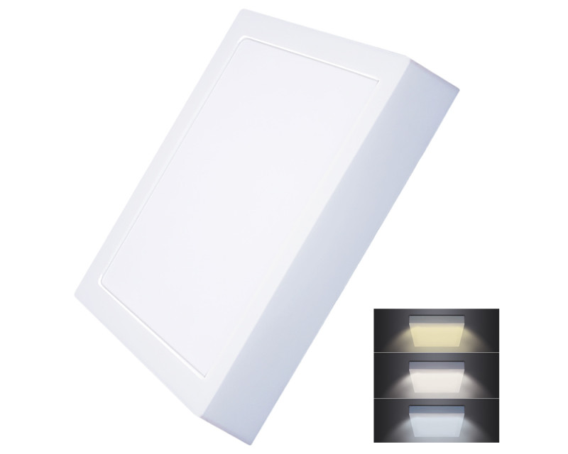 Čtvercový LED panel o výkonu 24 W v přisazeném provedení je ideálním řešením pro prostory, kde není možné zapustit svítidlo do stropu. Nabízí funkci přepínání teploty světla – 3000K, 4000K nebo 6000K – a přizpůsobí se tak každé situaci. Díky světelnému toku 1800 lm a úhlu svícení 160° poskytuje silné a rovnoměrné osvětlení.