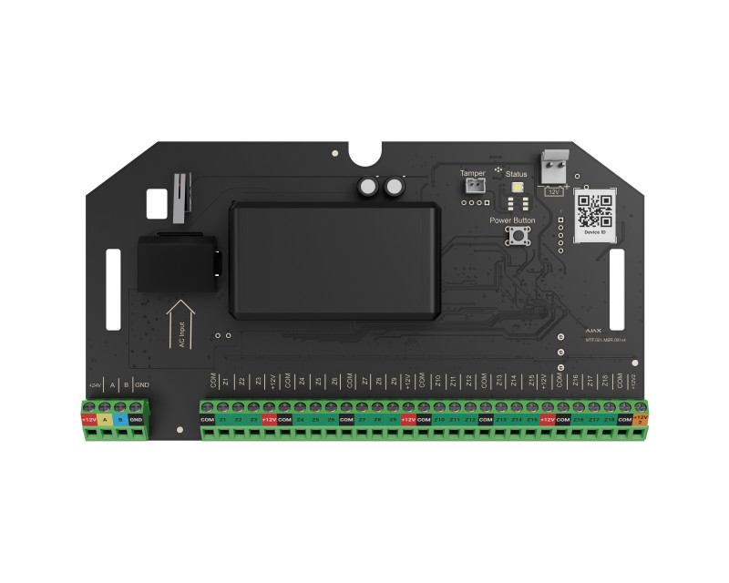 Drátový modul pro integraci drátových zařízení do systému Ajax, bez boxu, 18 vstupů, podpora 15 poplachových událostí, dosah mezi zařízením a detektory 400 metrů.