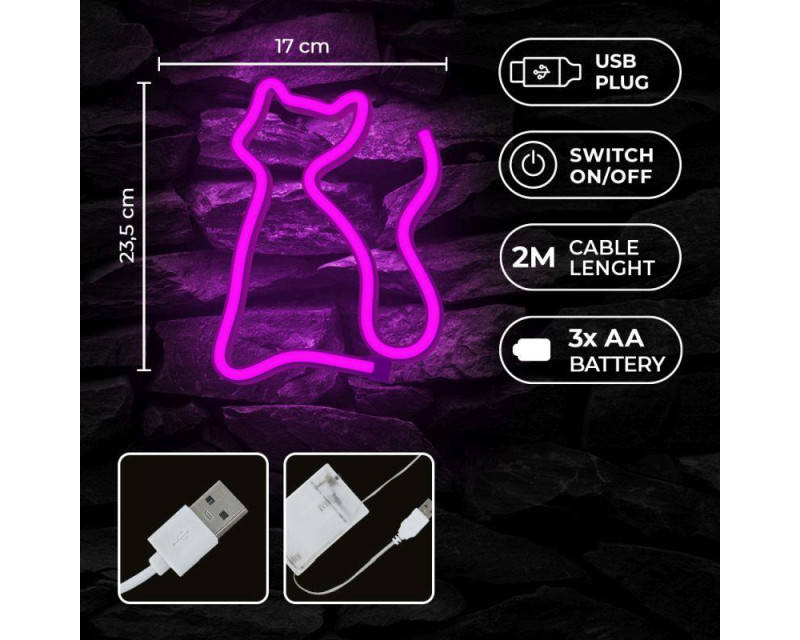 Díky technologii LED spotřebovávají neonové nápisy relativně málo elektřiny. Mohou být napájeny 3 bateriemi AA nebo zástrčkou USB. Neonové nápisy jsou k dispozici v mnoha tvarech a barvách včetně bílé, oranžové, zelené, červené a růžové. Zařízení je vyrobeno z plastu v bílé barvě. Rozměry závisí na typu provedení.