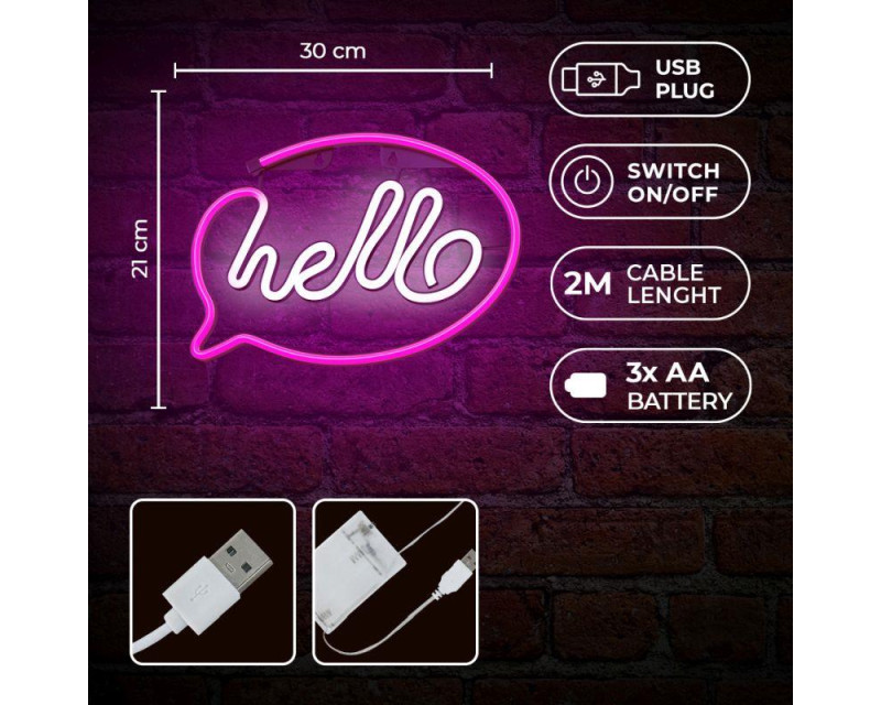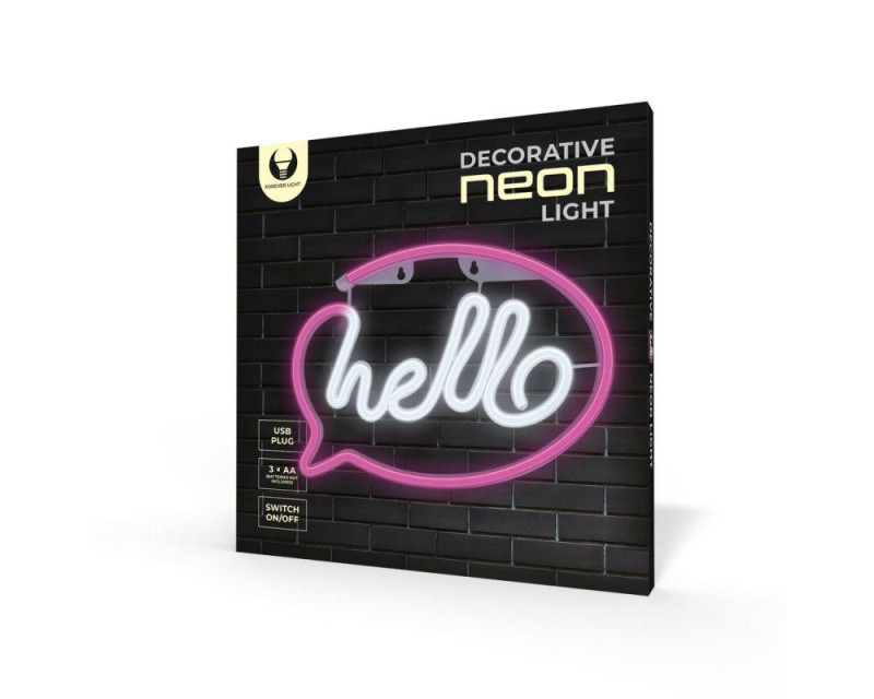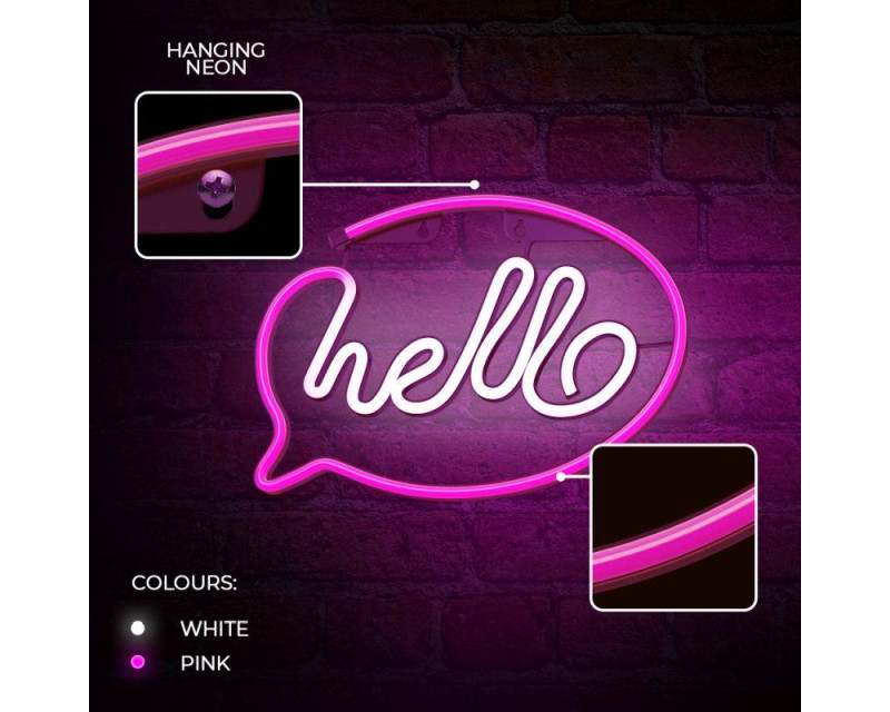 Díky technologii LED spotřebovávají neonové nápisy relativně málo elektřiny. Mohou být napájeny 3 bateriemi AA nebo zástrčkou USB. Neonové nápisy jsou k dispozici v mnoha tvarech a barvách včetně bílé, oranžové, zelené, červené a růžové. Zařízení je vyrobeno z plastu v bílé barvě. Rozměry závisí na typu provedení.