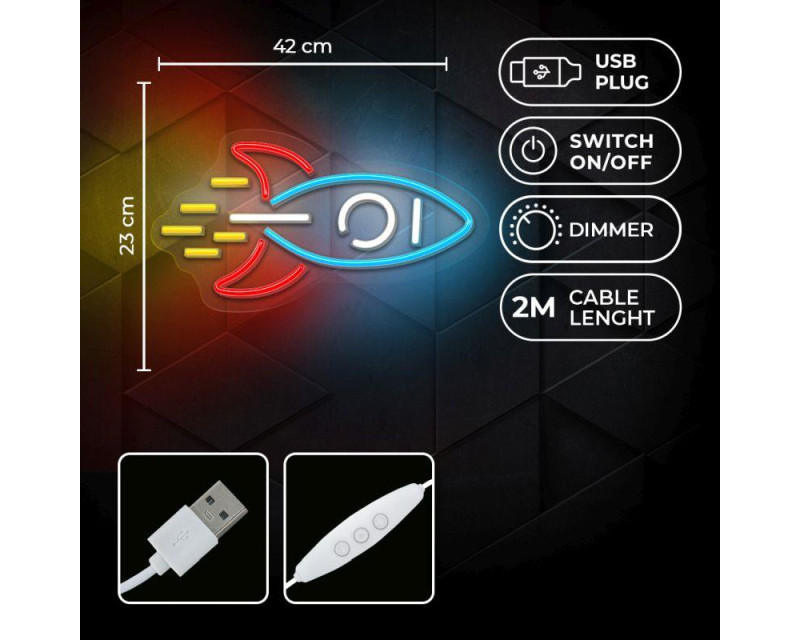 Dekorativní PLEXI LED neon Raketa multicolor od společnosti Forever Light oživí místnost jedinečným barevným světelným efektem. Jejich atmosférické světlo se dokonale hodí do výzdoby restaurací, barů a dalších prostor, kde barvy hrají důležitou roli při vytváření atmosféry. Charakteristickým rysem těchto neonových světel je rovnoměrné, jemně rozptýlené světlo, které nevytváří ostře ohraničené světelné body. Díky mimořádně úsporné technologii LED spotřebovávají malé množství elektrické energie. Navíc jsou napájeny prostřednictvím praktického portu USB. Neonové světlo ve tvaru rakety má barevné prvky a dokonale zapadne do každého prostoru. Je vyrobeno z průhledného a bílého plastu. Vlastnosti výrobku: - je vybaven světelným indikátorem, který je součástí balení.
