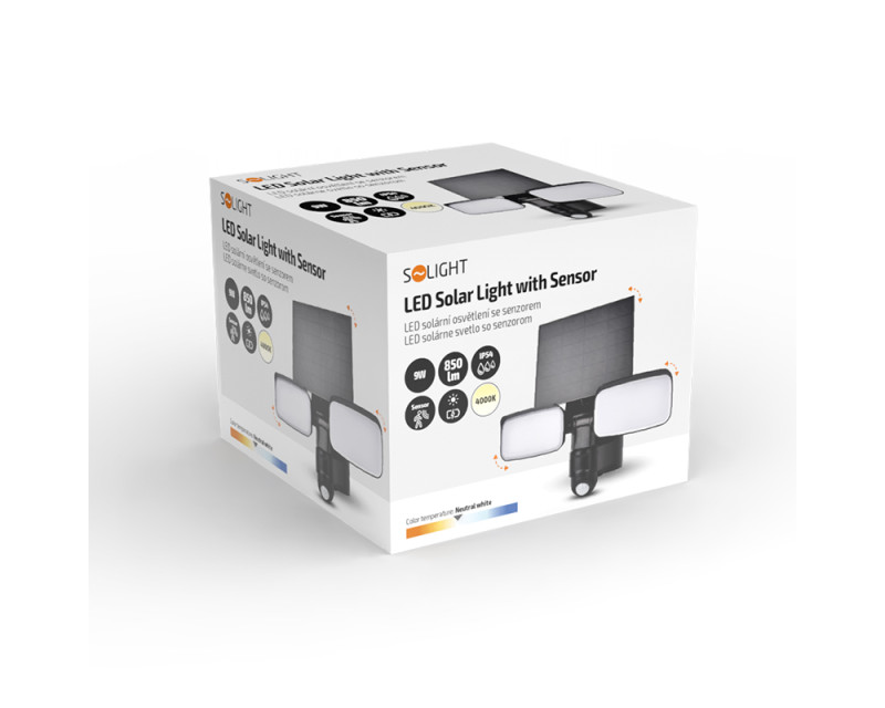 Solight LED solární osvětlení se senzorem, 9W, 850lm, 4000K, Li-Ion, černá