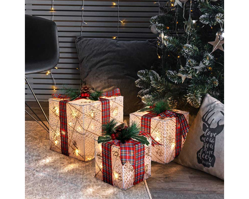 Sada obsahuje tři dárky různých velikostí (20 cm, 15 cm a 12 cm), které jsou osvětleny 48 LED diodami v teplé bílé barvě. Díky praktickému časovači se světla automaticky zapnou na 6 hodin a poté se na 18 hodin vypnou, což zajišťuje pohodlné a energeticky úsporné používání.