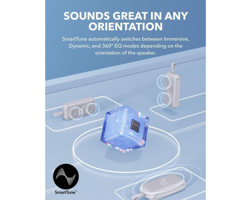 Technologie SmartTune: Exkluzivní adaptivní technologie přenosného reproduktoru Motion 300 se automaticky přizpůsobuje směru a orientaci reproduktoru, aby poskytovala nejlepší zvuk v jakékoli poloze zařízení.