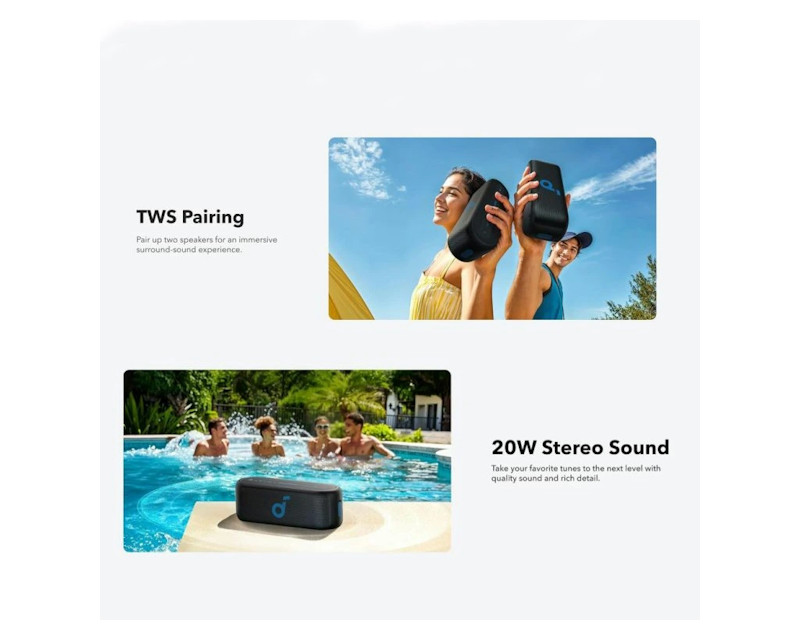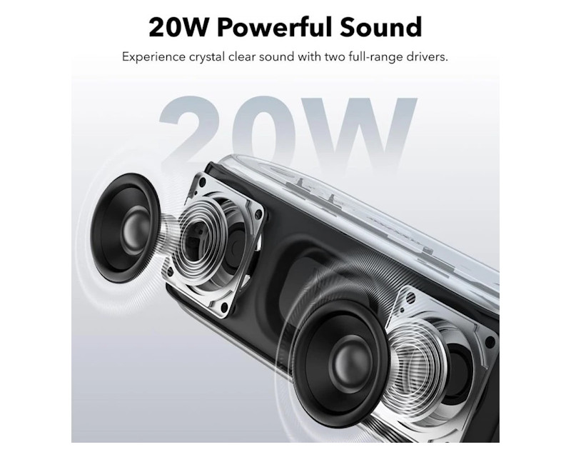 20W stereo zvuk a duální širokopásmové měniče: Zažijte bohatý 20W stereo zvuk a čistotu s tímto bezdrátovým Bluetooth reproduktorem s duálními širokopásmovými měniči.