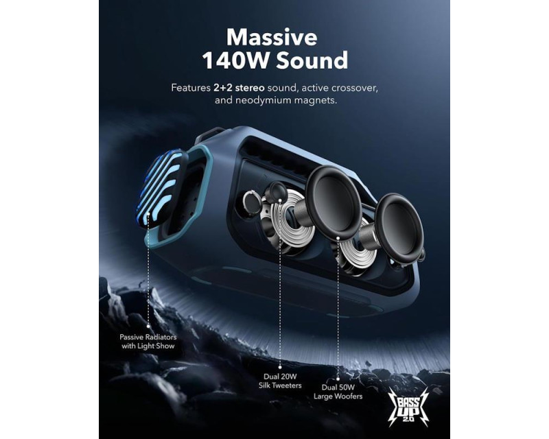 140W Max Booming Bass: Pociťte sílu basů v každé skladbě s duálními basovými reproduktory pro hloubku a čistotu. A s BassUp™? 2.0 je výstup zvýšen ze 100 W na ohromujících 140 W.