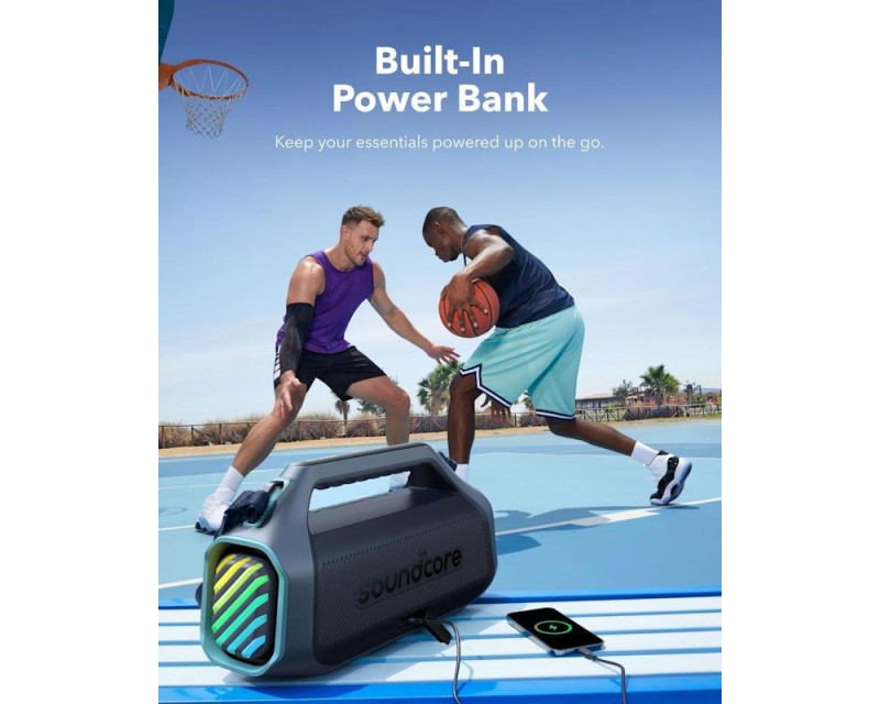 30W rychlé nabíjení a vestavěná power banka: Spárujte s 30W nabíječkou pro plné nabití venkovního reproduktoru Boom 2 Plus za pouhé 3 hodiny a udržení rytmu po dobu 20 hodin. S vestavěnou power bankou můžete svůj telefon a další nezbytnosti nabít 10W, ať jste kdekoli. (Doba přehrávání se může lišit v závislosti na úrovni hlasitosti a přehrávaného obsahu.