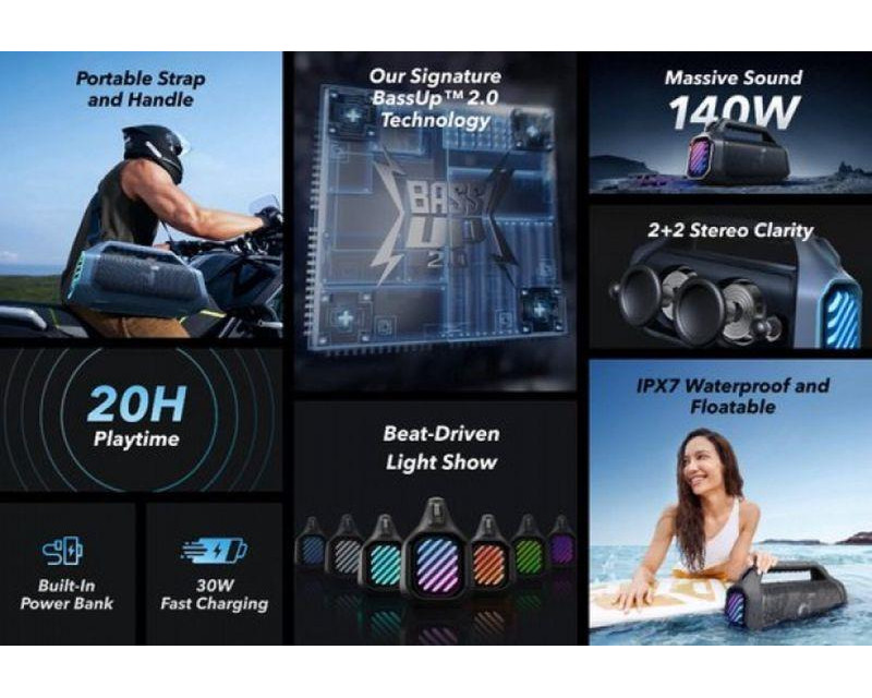 30W rychlé nabíjení a vestavěná power banka: Spárujte s 30W nabíječkou pro plné nabití venkovního reproduktoru Boom 2 Plus za pouhé 3 hodiny a udržení rytmu po dobu 20 hodin. S vestavěnou power bankou můžete svůj telefon a další nezbytnosti nabít 10W, ať jste kdekoli. (Doba přehrávání se může lišit v závislosti na úrovni hlasitosti a přehrávaného obsahu.