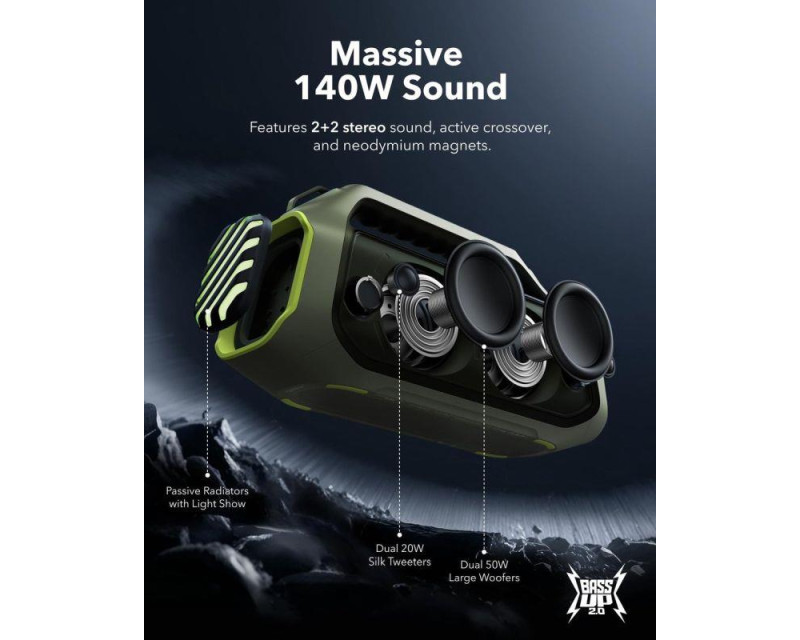 140W Max Booming Bass: Pociťte sílu basů v každé skladbě s duálními basovými reproduktory pro hloubku a čistotu. A s BassUp 2.0 je výstup zvýšen ze 100 W na ohromujících 140 W.