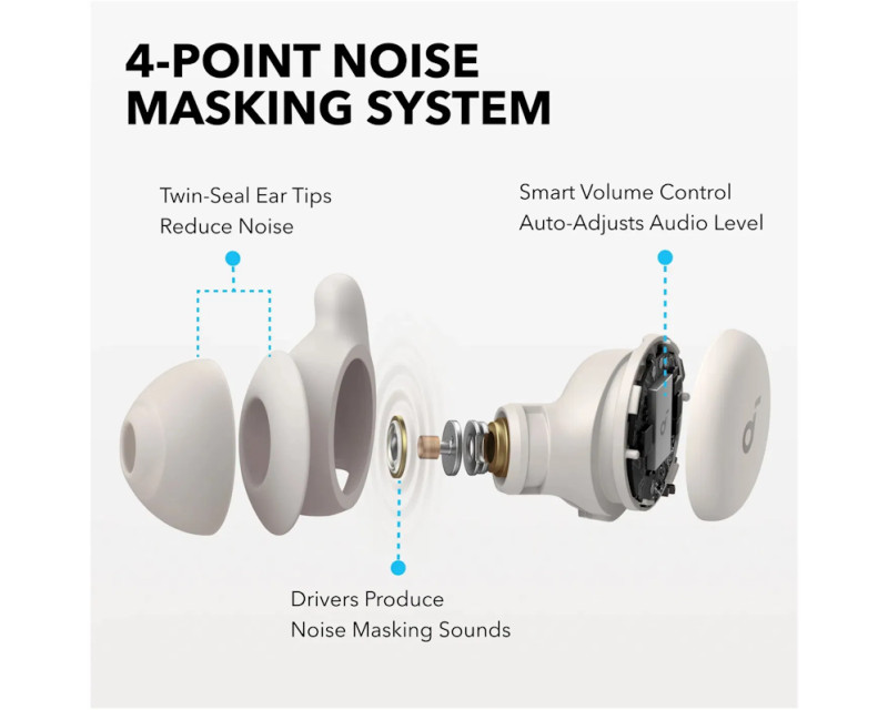 Plná noc klidného spánku: Díky řadě funkcí si vychutnáte náš exkluzivní 4bodový systém maskování hluku, ušní nástavce Twin-Seal s 3x silnějším pasivním blokováním hluku, maskováním zvuku a inteligentním ovládáním hlasitosti, které zabrání nežádoucímu hluku.