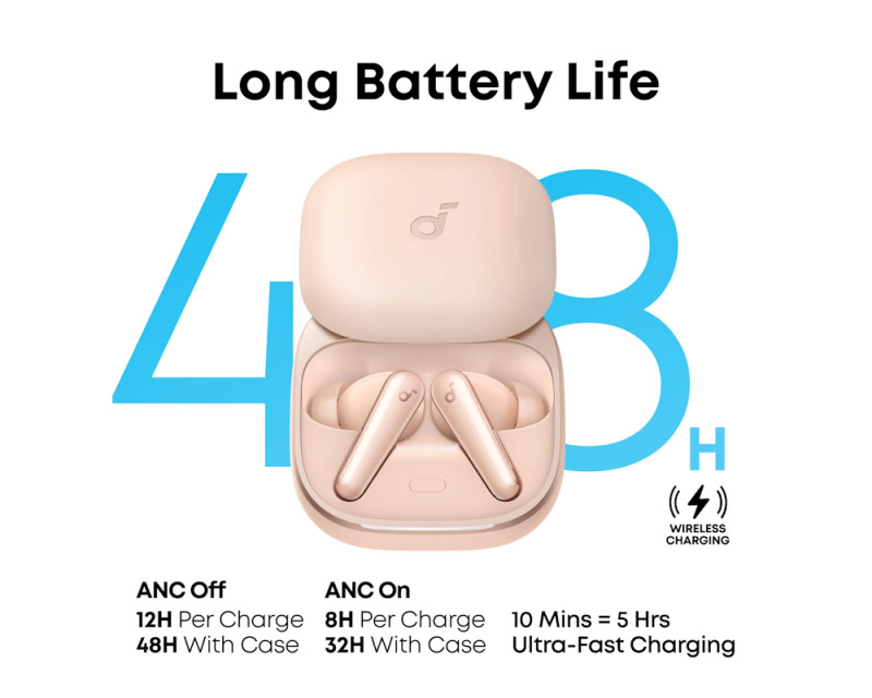 Výdrž sluchátek SoundCore Liberty 5 je velice nadstandardní s neuvěřitelnými 12 hodinami přehrávání na jedno nabití při vypnutém ANC a 8 hodinami přehrávání při zapnutém ANC.