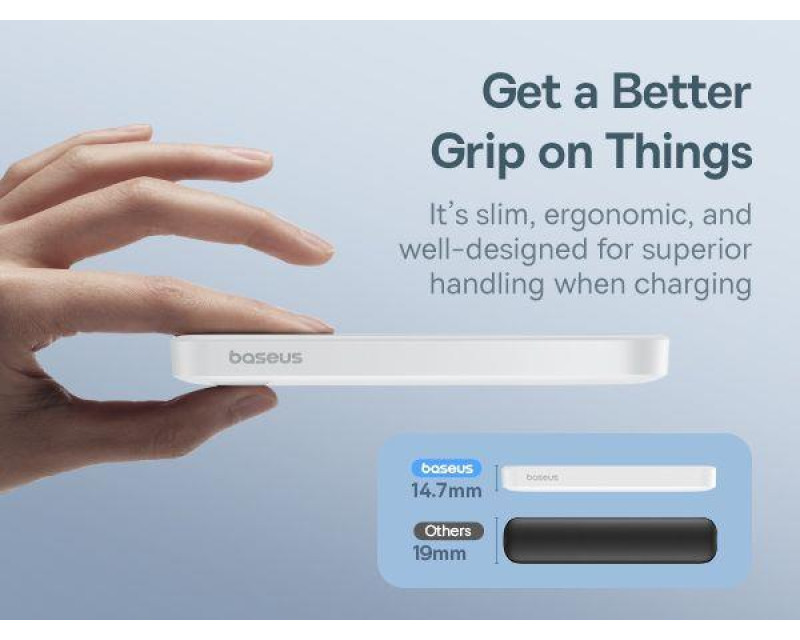 Zařízení Baseus vyniká nejen svým výkonem, ale také promyšleným designem. Díky své malé tloušťce, pouhých 14,7 mm, se pohodlně vejde do kapsy nebo kabelky, takže je vynikajícím společníkem na každou cestu nebo při každodenním používání. I přes své kompaktní rozměry zaručuje bezpečné nabíjení vašeho zařízení, takže se nemusíte bát případného poškození vašeho zařízení. Tato powerbanka dokonale kombinuje praktičnost s elegantním designem a splní očekávání i těch nejnáročnějších uživatelů.
