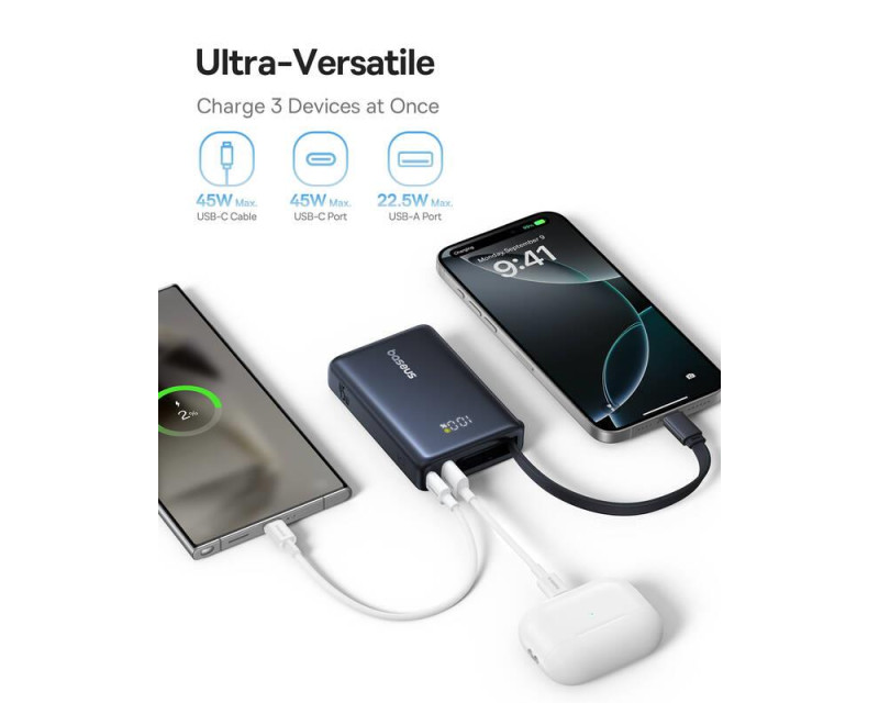 Nabíjení více zařízení: Umožňuje nabíjení až tří zařízení pomocí dvou portů USB-C a jednoho portu USB-A