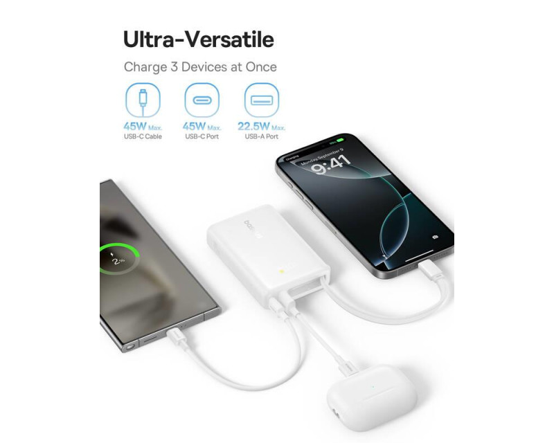 Nabíjení více zařízení: Umožňuje nabíjení až tří zařízení pomocí dvou portů USB-C a jednoho portu USB-A