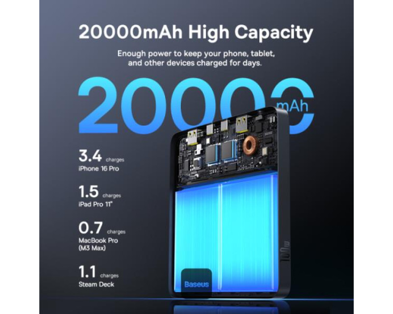 Power banka Baseus Blade H1 20000mAh 100W je dokonalým společníkem na cesty. Díky rychlému nabíjení 100W PD dokáže rychle nabíjet notebooky, herní konzole i chytré telefony. Tato přenosná nabíječka nabízí stav baterie v reálném čase pomocí digitálního displeje, který usnadňuje sledování úrovně energie. Její kapacita 20000 mAh zajišťuje vícenásobné nabití.