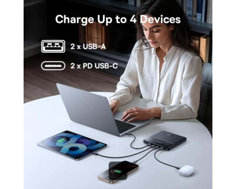 Power banka Baseus je vybavena dvěma porty USB-C a USB-A, které umožňují nabíjet až 4 zařízení současně. Ať už jste na služební cestě, dojíždíte do práce nebo si užíváte víkendový výlet, tato power banka s rychlým nabíjením vám poskytne pohodlí a efektivitu. Její kompaktní design a elegantní matně černá povrchová úprava z ní dělají stylový a praktický doplněk pro profesionály a cestovatele.