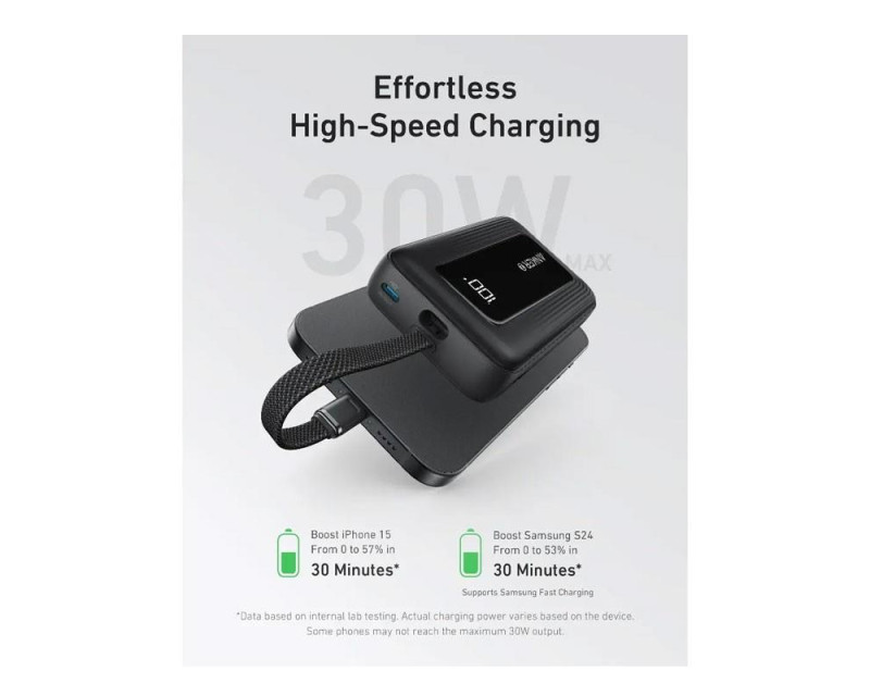 30W rychlé nabíjení: Podporuje 30W rychlé nabíjení přes vestavěný kabel USB-C