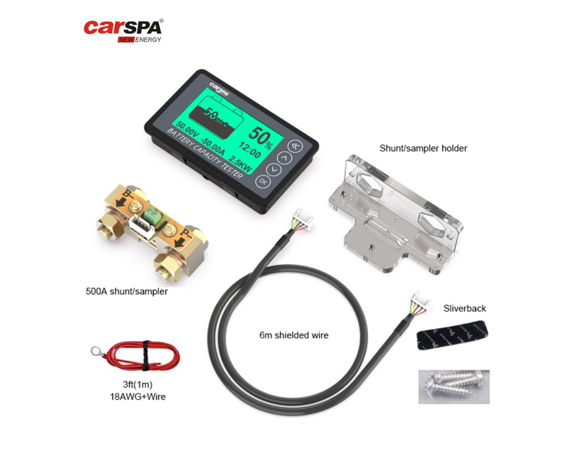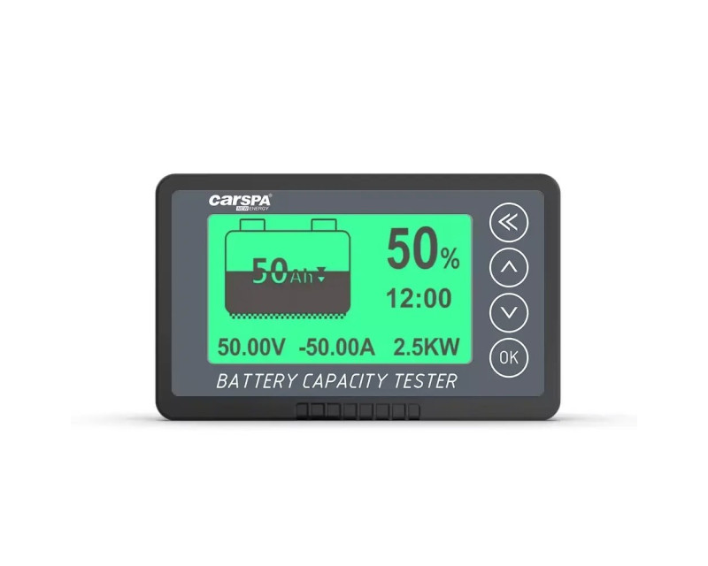 Sledovač stavu baterií Carspa BM500 je přesný měřič kapacity baterie vhodný pro různé typy baterií (LiFePO4, olověné, Ni-Cd/Ni-MH atd.) s pracovním napětím 8–120 V. Sleduje aktuální stav nabití, kapacitu, napětí, proud, výkon a dobu nabíjení/vybíjení. Díky nízké spotřebě a ochraně proti obrácenému zapojení je spolehlivý a úsporný. Disponuje zeleným podsvícením, vysokou přesností ±1 %, a je dostupný v různých proudových variantách (75 až 750 A), což z něj činí univerzální řešení pro obytné vozy, solární systémy, lékařské či mobilní aplikace, přenosná zařízení nebo jiné aplikace s bateriemi.