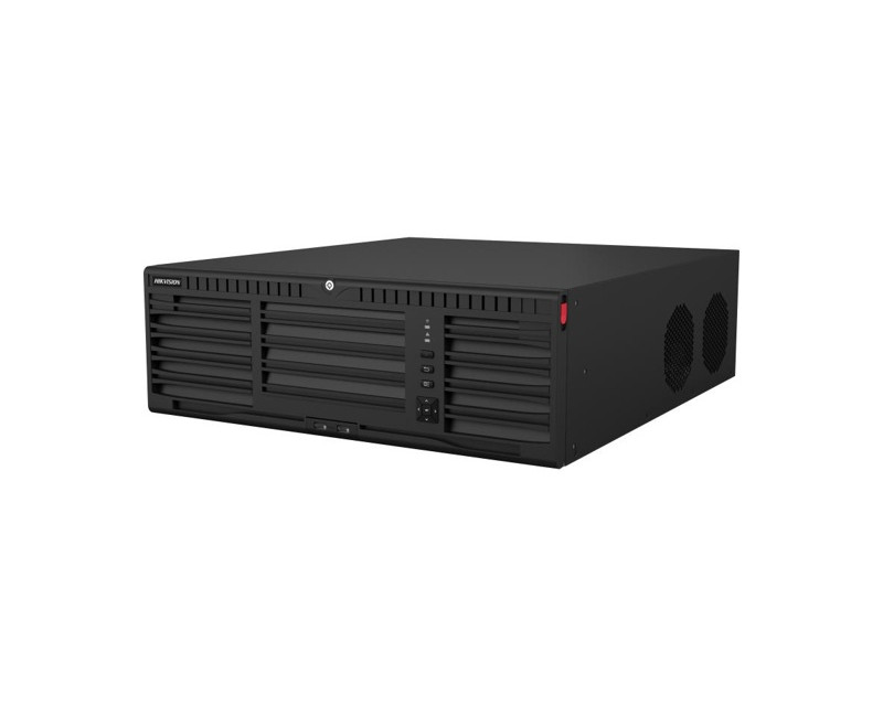 IP záznamové zařízení (NVR) HikVision 128 kanálový síťový digitální videorekordér, komprese H.265+/H.265/H.264+/H.264, vstupní/odchozí šířka pásma 400Mbps / 400Mbps, až 32Mpx rozlišení záznamu kamer, 2x HDMI, 2x VGA, 1x BNC výstup, 4x USB, RS-485, RS-232, 2x Gigabit NIC, 16x SATA, 1x eSATA, každý HDD až 16TB, RAID 0/1/5/6/10, podpora POS, ANR, obousměrné audio, výklopný přední panel pro snadnou instalaci HDD, poplachové I/O: 16/9, výstup 12VDC 1A, 1x alarmový výstup 12VDC 1A, napájení: 100~240V AC 50W (bez HDD), 19" 3U