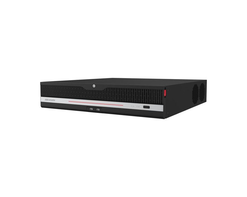 IP záznamové zařízení (NVR) HikVision 64 kanálový DeepinMind síťový digitální videorekordér, 24 kanálů (2Mpx) perimetr AcuSense nebo 16 kanálů (2Mpx) rozpoznání obličeje, komprese H.265+/H.265/H.264+/H.264, vstupní/odchozí šířka pásma 400Mbps /400Mbps, až 12Mpx (max. 8x 24/32Mpx) rozlišení záznamu kamer, 2x HDMI (8K, 4K), 2x VGA (FullHD), 1x CVBS výstup, 3x USB, 2x Gigabit NIC, 8x SATA, každý HDD až 14TB, RAID0,1,5,6,10, podpora POS, ANR, ONVIF, Hik-connect, 1x eSATA, RS-485, RS-232, KB port, obousměrné audio, poplachové I/O: 16/9, výstup 12V DC - 1A, napájení: 230V AC - 50W (bez HDD), 445 x 465 x 93mm 2U