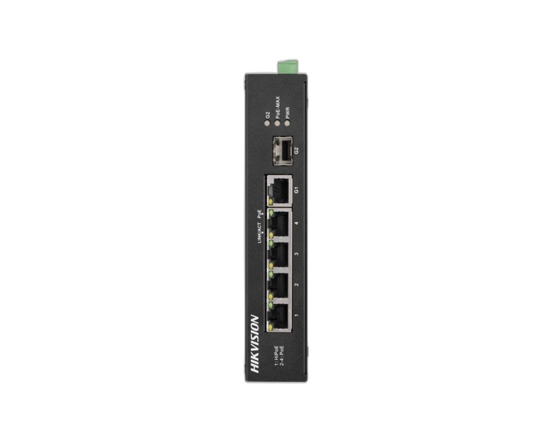 Switche a POE napájení 6 portový průmyslový switch - 1x HiPoE 90W 10/100Mbps + 3x PoE 30W 10/100Mbps + 1x uplink RJ-45 1Gbps + 1x uplink SFP slot 1Gbps, PoE celkem max. 110W, bez managementu, prodloužený režim (porty 3 - 4), kovové šasi, bez ventilátoru, stavové LED, rozměry 158 x 101 x 32mm, instalace na DIN lištu, provozní teploty -40°C až +75°C, napájení 48-57VDC 10W (bez zdroje)