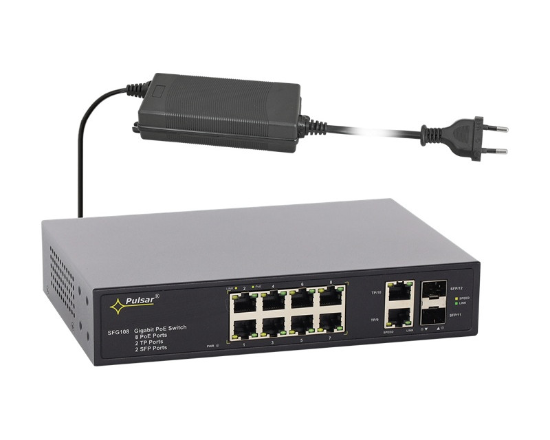 Switche a POE napájení Pulsar 12portový switch – 8x PoE 1Gbps + 2x uplink RJ45 1Gbps + 2x uplink SFP 1Gbps, PoE výstup 52V DC, 30W/port, celkem max. 80W, automatická detekce zařízení ve standardu IEEE 802.3af/at (PoE/PoE+), optická signalizace LED, napájení 100–240V AC, stolní zdroj 90W/1.75A součástí, rozměry 220 x 44 x 150mm [+/-2mm], montážní rozměry 1U, montáž do RACK 19", držák pro RACK součástí, záruka 2 roky