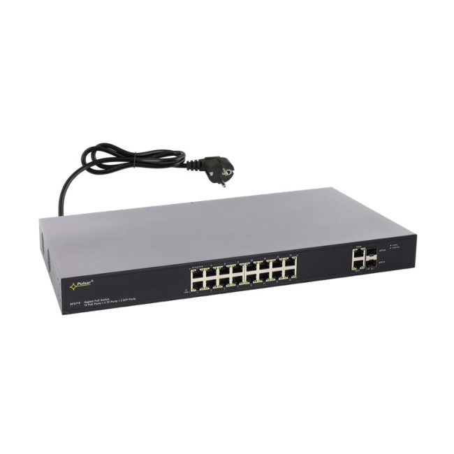Switche a POE napájení Pulsar 16portový switch – 16x PoE 1Gbps + 2x uplink RJ45 1Gbps + 2x uplink SFP 1Gbps, PoE výstup 52V DC, 30W/port, celkem max. 160W, automatická detekce zařízení ve standardu IEEE 802.3af/at (PoE/PoE+), optická signalizace LED, napájení 100–240V AC, rozměry 442 x 44 x 290mm [+/-2mm], montážní rozměry 1U, montáž do RACK 19", držák pro RACK součástí, záruka 2 roky