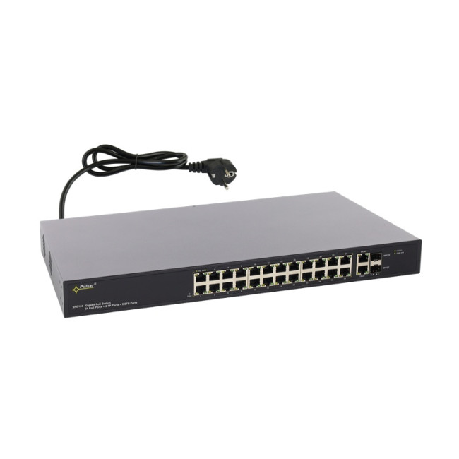 Switche a POE napájení Pulsar 24portový switch – 24x PoE 1Gbps + 2x uplink RJ45 1Gbps + 2x uplink SFP 1Gbps, PoE výstup 52V DC, 30W/port, celkem max. 240W, automatická detekce zařízení ve standardu IEEE 802.3af/at (PoE/PoE+), optická signalizace LED, napájení 100–240V AC, rozměry 442 x 44 x 290mm [+/-2mm], montážní rozměry 1U, montáž do RACK 19", držák pro RACK součástí, záruka 2 roky