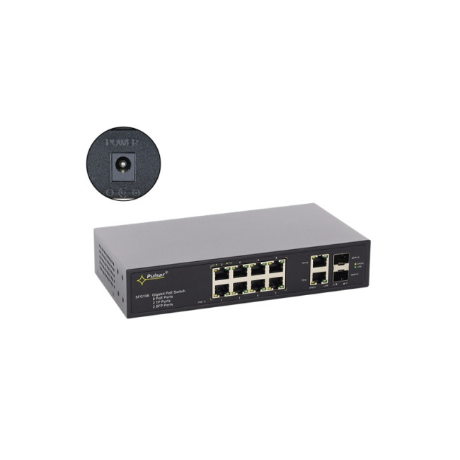 Switche a POE napájení Pulsar 12 portový switch – 8x PoE 30W 1Gbps + 2x uplink RJ-45 1Gbps + 2x uplink SFP 1Gbps, PoE celkem max. 120W, bez managementu, kovové šasi, stavové LED, rozměry 220 x 44 x 150mm RACK 1U, napájení 48–57VDC, zdroj není součástí