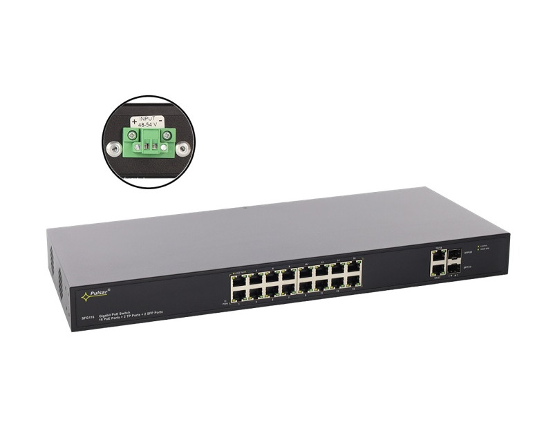 Switche a POE napájení Pulsar 16 portový switch – 16x PoE 30W 1Gbps + 2x uplink RJ-45 1Gbps + 2x uplink SFP 1Gbps, PoE celkem max. 240W, bez managementu, kovové šasi, stavové LED, rozměry 442 x 44 x 224mm RACK 1U, napájení 48–54VDC, zdroj není součástí