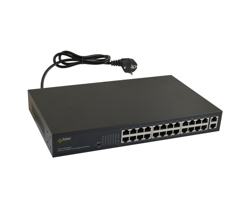 Switche a POE napájení Pulsar 24 portový switch – 24x PoE 30W 100Mbps + 2x uplink 1Gbps, PoE celkem max. 160W, bez managementu, prodloužený režim (porty 17–24), kovové šasi, stavové LED, rozměry 330 x 44 x 204mm RACK 1U, napájení 100–240VAC, zdroj součástí