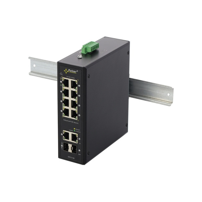 Switche a POE napájení Pulsar 12 portový switch – 8x RJ-45 1000Mbps PoE+ IEEE 802.3af/at, 2x RJ-45 1000Mbps, 2x SFP 1000Mbps, PoE celkem max. 120W, bez managementu, automatická detekce PoE zařízení, kovové šasi, stavové LED, rozměry 54 x 176 x 153mm, napájení 12–57VDC, zdroj není součástí.