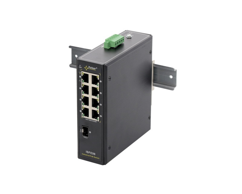 Switche a POE napájení Pulsar 9 portový switch – 8x RJ-45 2.5Gbps PoE+ IEEE 802.3af/at, 1x SFP 10Gbps, PoE celkem max. 120W, bez managementu, automatická detekce PoE zařízení, kovové šasi, stavové LED, rozměry 30 x 128 x 112mm, napájení 12–57VDC, zdroj není součástí.