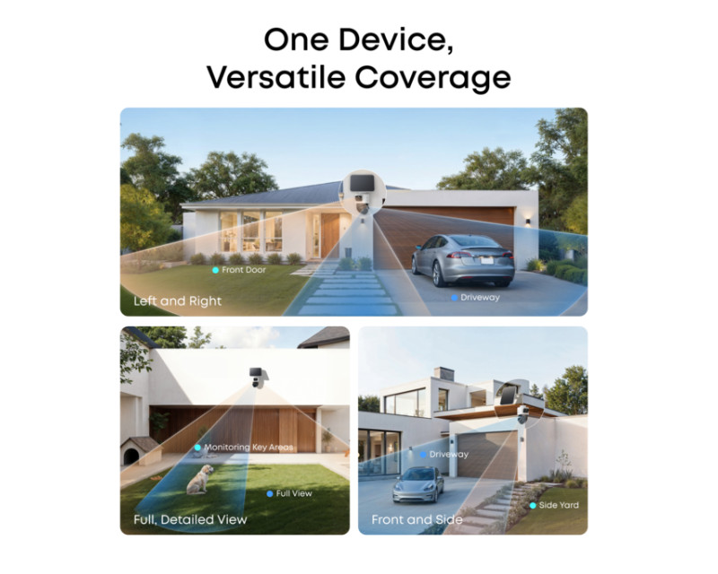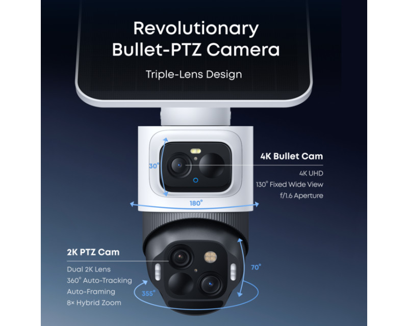 Kombinovaný design: Každá kamera má 4K bullet kameru se 130° zorným úhlem a 2K PTZ modul s možností otáčení o 360° a náklonu až 70°, umožňující detailní sledování a zoom až na 50 metrů.