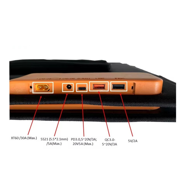 Flexibilní a přenosná konstrukce: Skládací a lehká konstrukce solárního panelu umožňuje snadnou přepravu a skladování. Lze jej snadno přenášet a postavit kdekoli tak, aby využíval sluneční světlo k nabíjení zařízení nebo napájení spotřebičů.