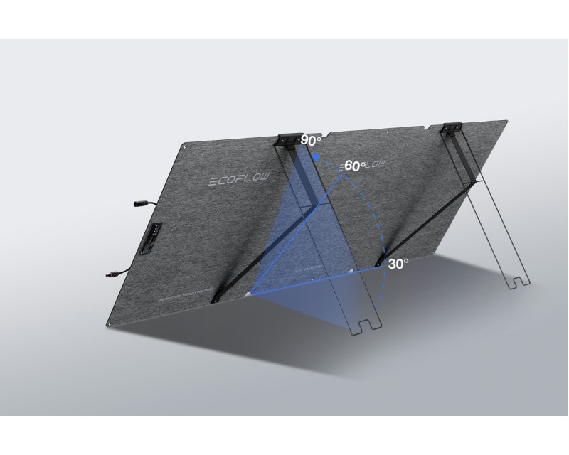 Panel přináší možnost získání více energie ze slunečního záření, a to díky vestavěnému ukazateli úhlu dopadu slunečních paprsků a integrovanému stojanu, kterým lze naklápět panel v rozsahu 30° až 60° podle aktuální pozice slunce. Panel je možné snadno připojit například k bateriové stanici EcoFlow a maximálně využít energii slunečních dnů.