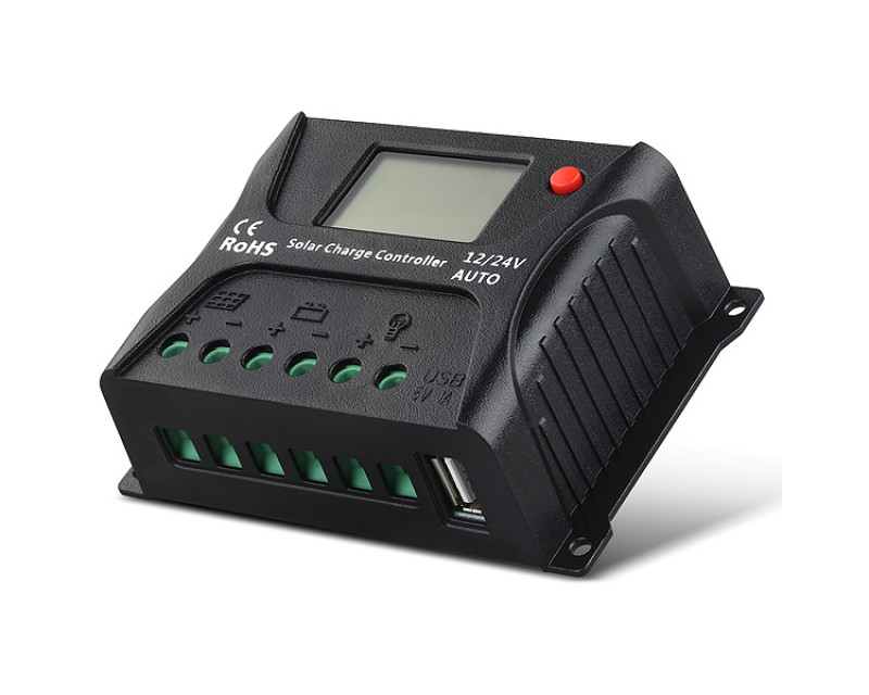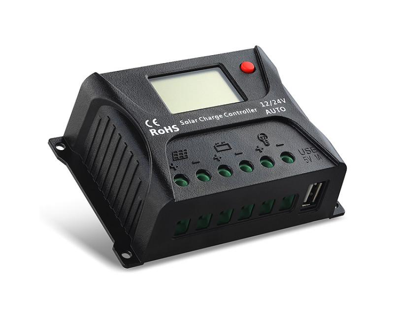 PWM regulátor kontroluje nabíjení a vybíjení baterie - upravuje napětí ze solárního panelu tak, aby bylo využitelné pro nabíjení akumulátoru a provoz 12V/24V zátěže.